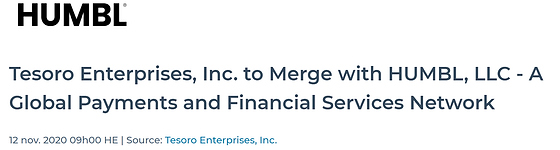 Humbl Completes Merger With Tesoro Enterprises Inc Sells Warrants With Provision For 50 Million In Funding